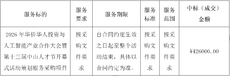 二、项目名称:2026年华侨华人投资与人工智能产业合作大会暨第十三届中山人才节开幕式活动策划服务采购项目