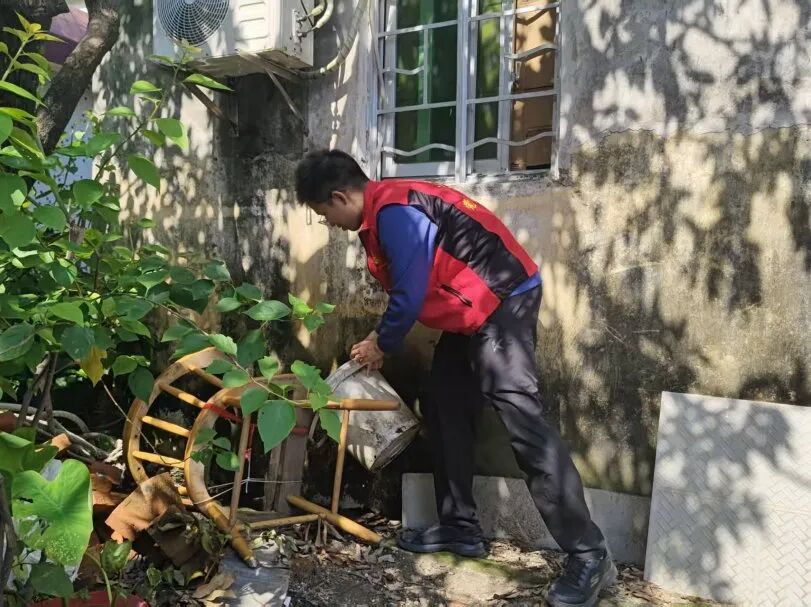 在防控工作中,党员志愿者注重科学施策,针对花斑蚊繁殖特性,重点清理房前屋后、绿化带、闲置空地等区域的积水容器。他们提醒村民要做好个人防护,建议穿着浅色长袖衣裤,使用有效驱蚊产品,减少在蚊虫密集区域逗留。
